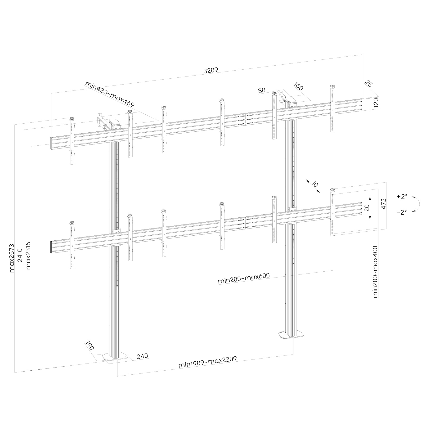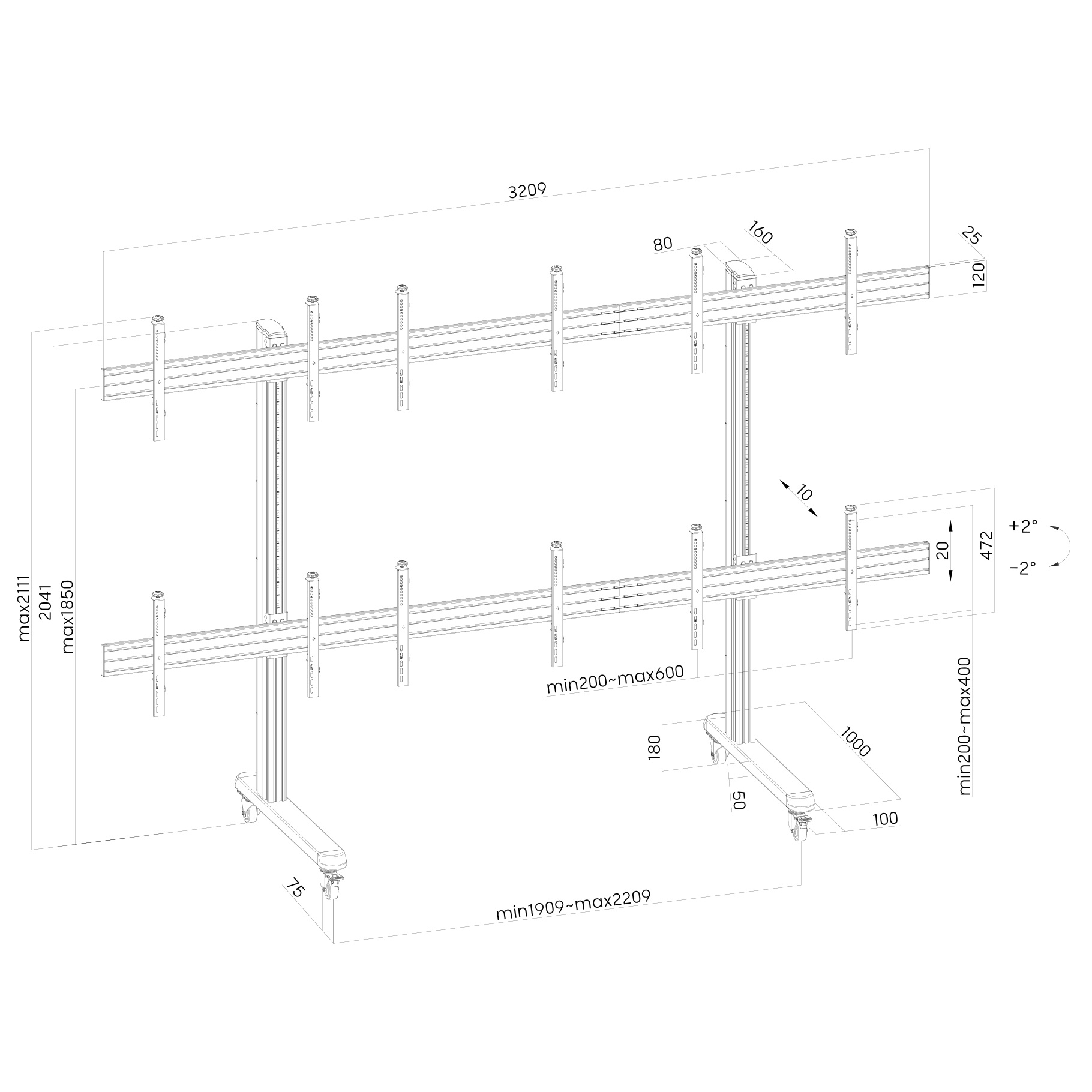 Este soporte profesional para videowall consta de dos robustas bases de suelo (100 x 10 cm) para una estabilidad perfecta, y dos mástiles resistentes en los que podrá ajustar fácilmente el nivel de sus pantallas (hasta 240 cm de altura, centro de las pantallas superiores).