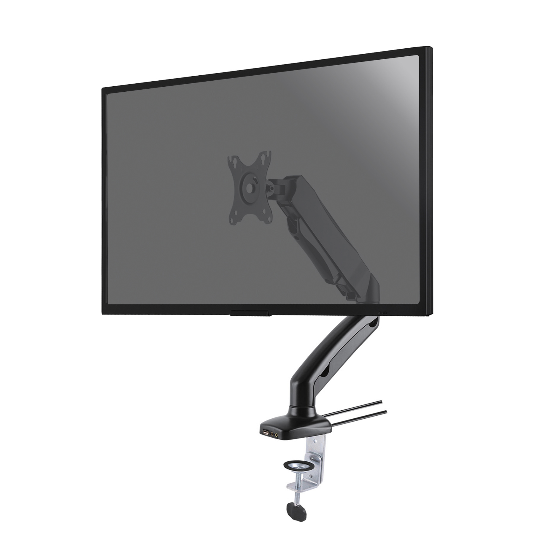 Maximice su espacio con el soporte de mesa Kimex 015-2201 🖥️. Ideal para monitores de 13 a 27", ofrece ajuste completo: giro (180°), inclinación (90°) y rotación (360°) 🔄. Se monta al borde de la mesa o a través del pasacables 📏. Equipado con 2 puertos USB y de AUDIO para conectividad adicional 🔌. Perfecto para crear un ambiente de trabajo ergonómico y moderno, combinando estilo y funcionalidad 🎯.