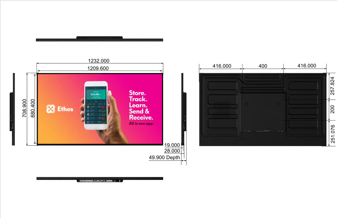 Esta pantalla es apta para uso comercial constante, con una duración de más de 70,000 horas, y carece de botones externos para prevenir manipulación. También incluye software de programación gratuito, lo que permite mostrar contenido diferente en distintos momentos del día, así como un mensaje de texto en estilo de “ticker tape” en la parte inferior de la pantalla.