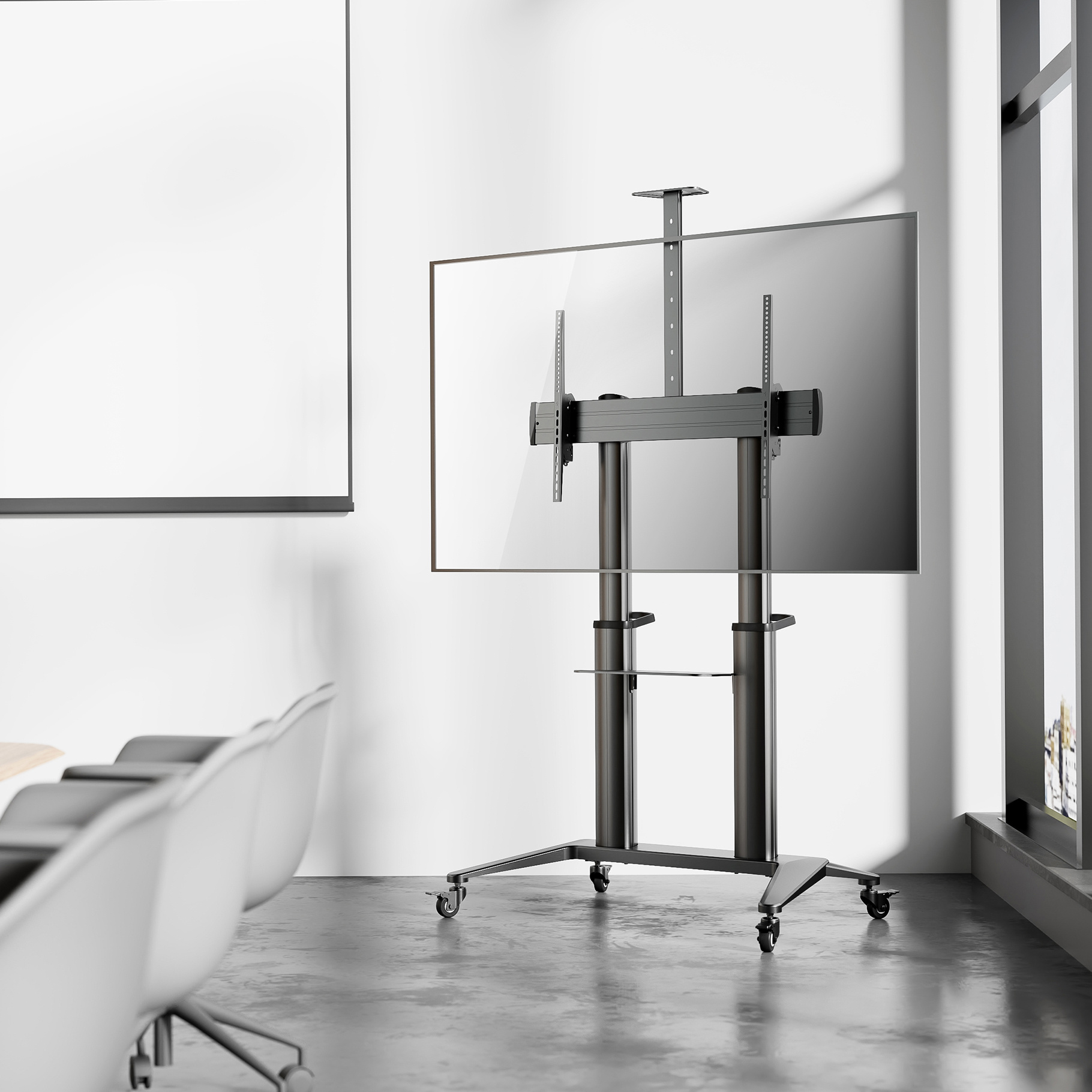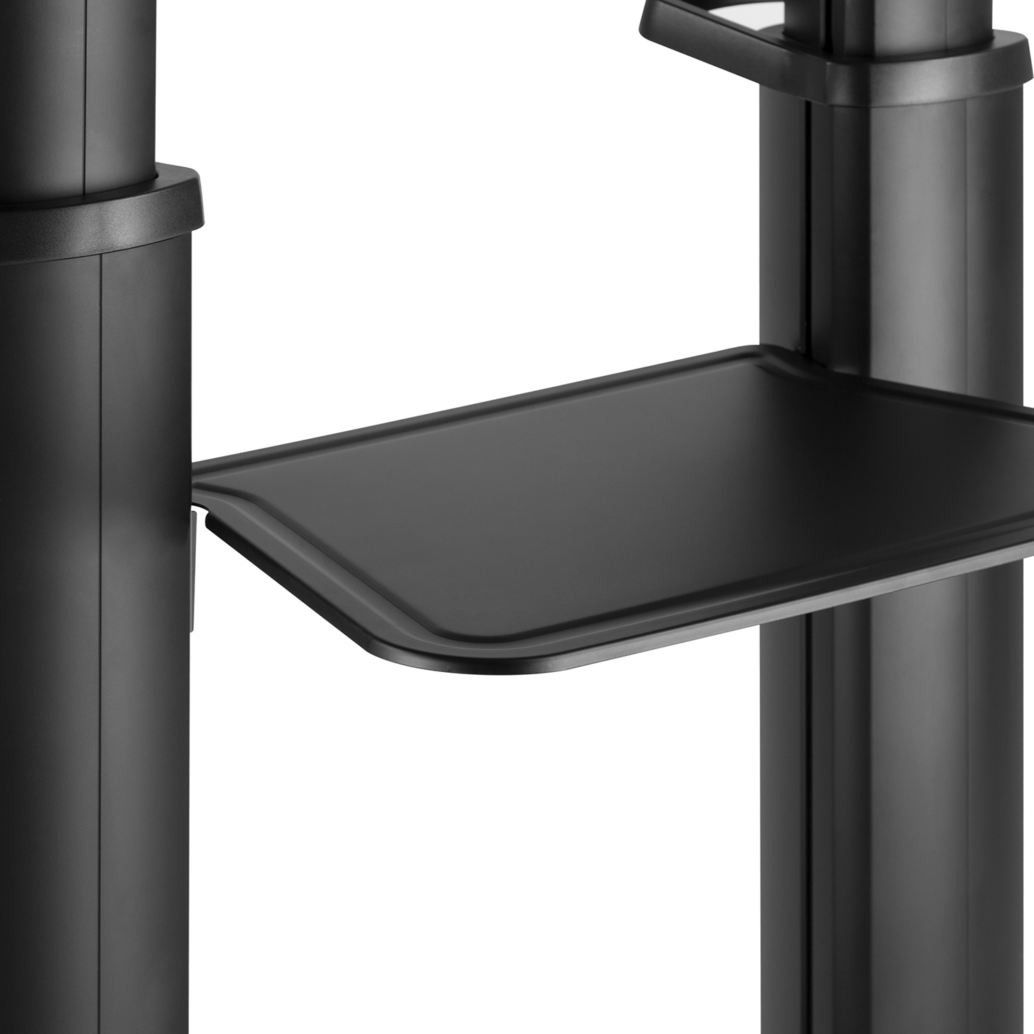 El soporte de suelo 030-1205 está diseñado para pantallas de 70 a 120″ compatibles VESA (200×200 min, 1000×600 max), hasta 140 kg. Este soporte profesional consta de una base de suelo con ruedas para facilitar la movilidad y dos robustos postes que permiten ajustar fácilmente el nivel de la pantalla de 125 a 160 cm (centro de la pantalla). El soporte 030-1205 es muy funcional, permite inclinar su pantalla (+5/- 10°) fácilmente para adaptarse a todas sus necesidades y proporcionar el mejor confort de visualización. Además, cuenta con dos bandejas extraíbles y regulables en altura, la superior para alojar una cámara de videoconferencia y la central para sus accesorios audiovisuales. El soporte de suelo KIMEX 030-1205 es, por tanto, una solución ideal para el uso activo en entornos profesionales en oficinas para videoconferencias o para equipar salas de exposiciones.