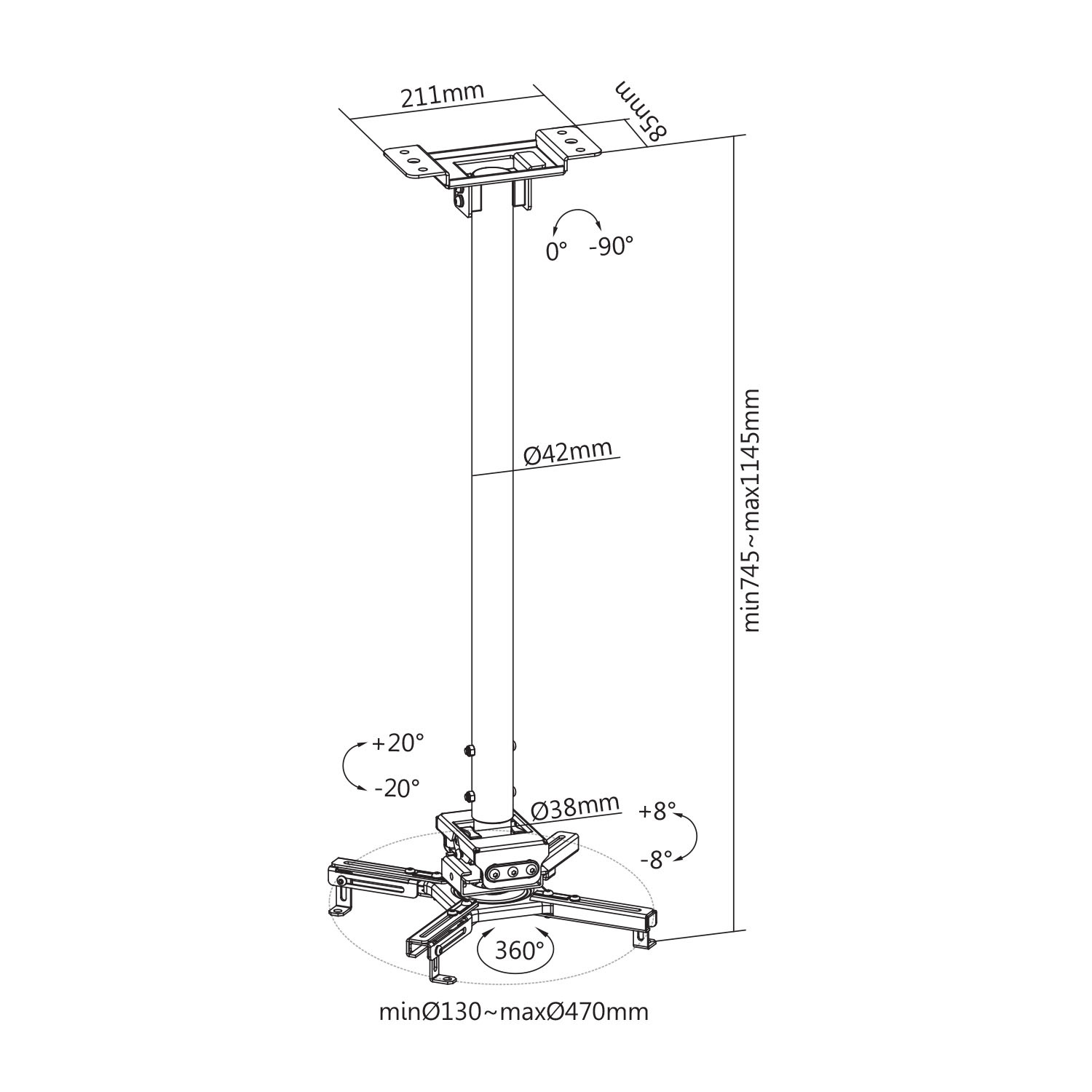 El KIMEX 052-3021 es compatible con la mayoría de proyectores de hasta 35 kg. Ofrece una altura ajustable de entre 75 y 115 cm desde el techo. La placa de montaje permite girar el proyector 360° e inclinarlo ±20°, asegurando un ajuste preciso de la imagen en la pantalla de proyección. Además, el modelo incluye 4 puntos de fijación ajustables (diámetro de 13-47 cm) para adaptarse a diferentes proyectores. La gestión del cableado está integrada, proporcionando un acabado estético y ordenado.