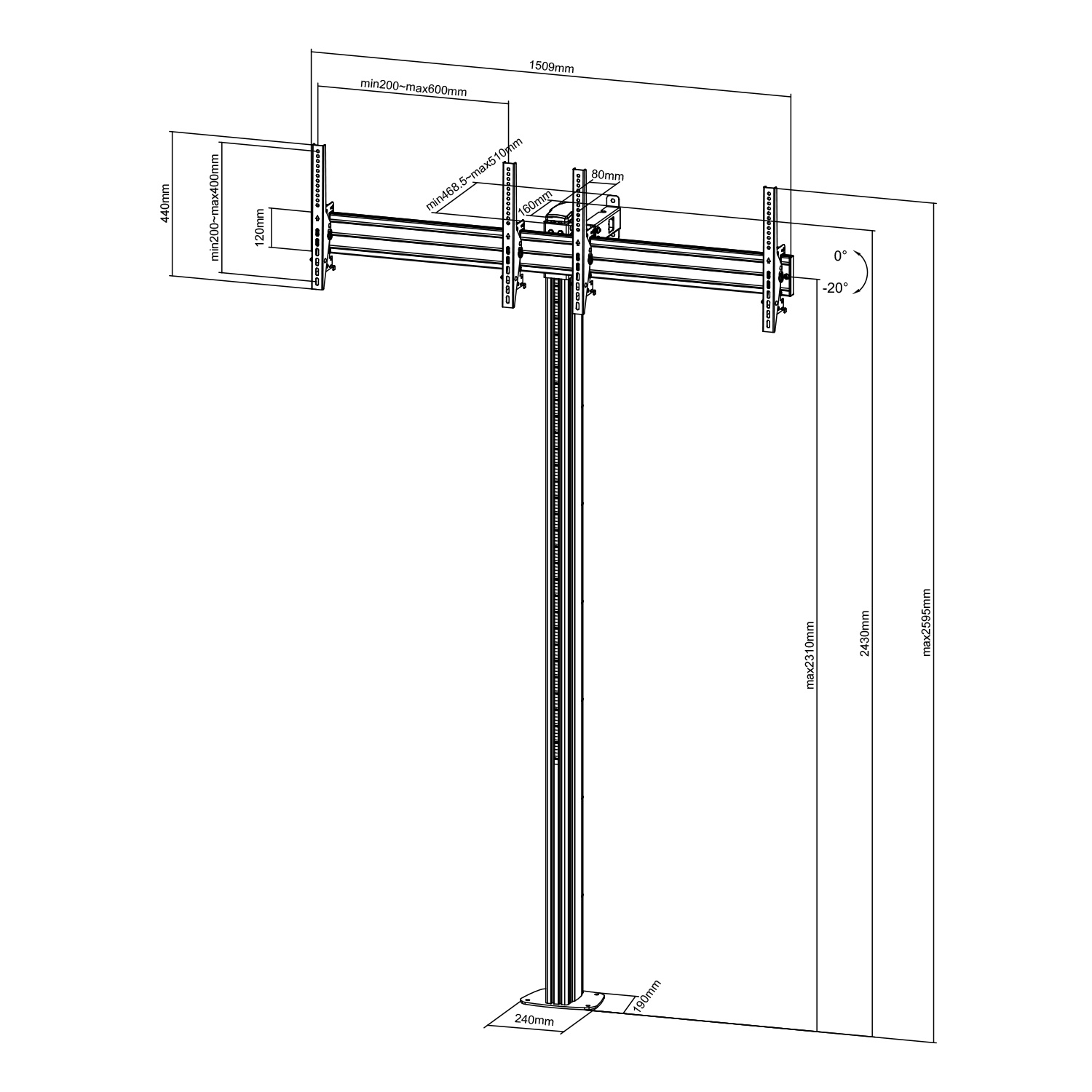 El soporte KIMEX 031-1213K3 está diseñado para montar dos pantallas de TV de 43” a 49” según el estándar VESA (100×100 min, 400x400mm max), hasta 50kg. Este soporte profesional se compone de una sólida base que se fija al suelo para una perfecta estabilidad y el mínimo espacio, y de un robusto poste en el que podrá adaptar fácilmente el nivel de sus pantallas (hasta 240 cm de altura). Las barras de montaje VESA tienen un sistema eficiente de inclinación (0°/ -5° / -10°/ -15° y -20°) que permite ajustar con precisión la posición y la orientación de las pantallas. Funcional y versátil, el soporte KIMEX 031-1213K3 destaca por su diseño moderno y elegante que lo convierte en una solución ideal para su uso activo en entornos profesionales, ferias, centros comerciales, escaparates, etc.