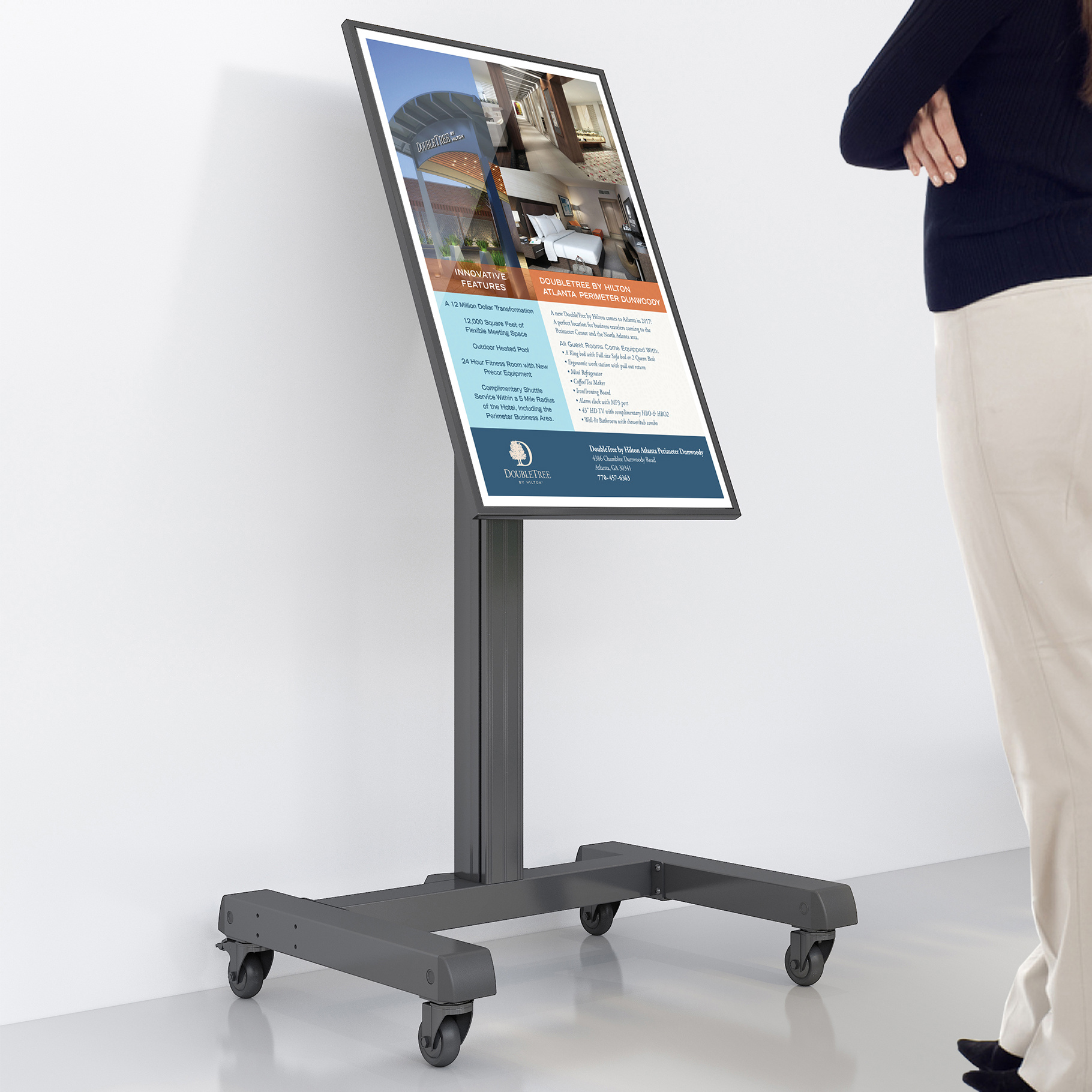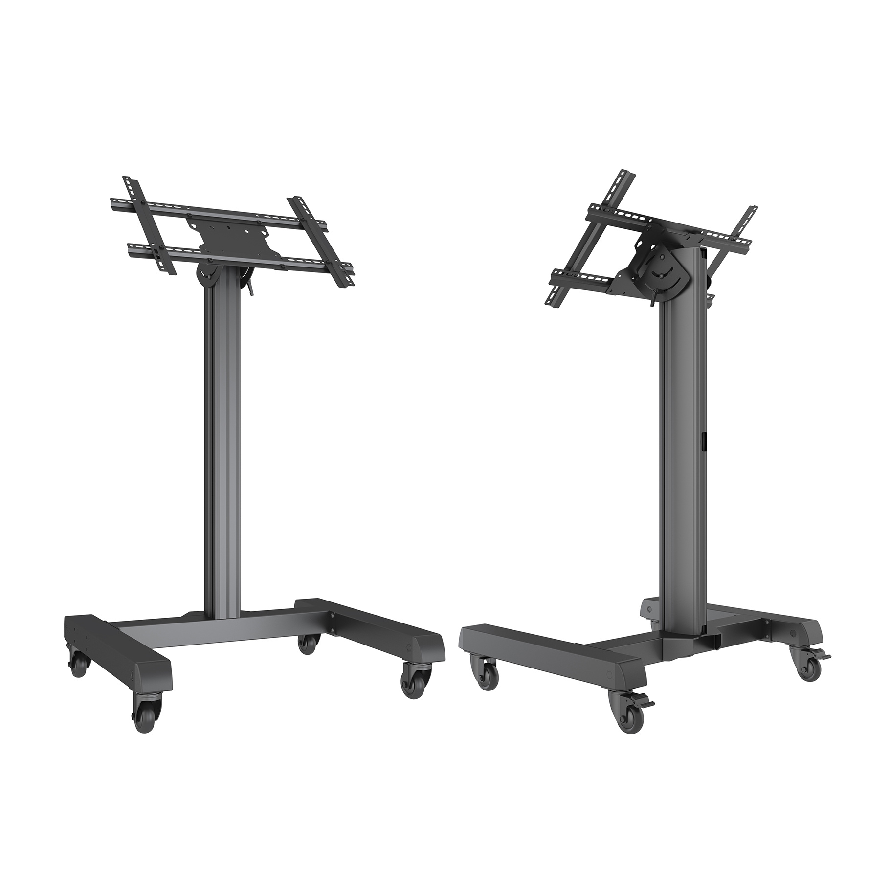 Este soporte móvil es adecuado para televisores de 32″ a 75″ que cumplan la norma VESA 100x100min, 600x400mm max, hasta 70 Kg, para todo tipo de aplicaciones profesionales. Funcional, este soporte se basa en un mecanismo que le permite ajustar la inclinación de la pantalla hasta 90° para colocarla en modo mesa, y girarla 90° en modo horizontal o vertical para adaptarse a cada necesidad. Equipado con ruedas robustas, este carrito móvil es ideal para acompañarle durante sus actuaciones, y también cuenta con un sistema de gestión de cables para un acabado estético perfecto.