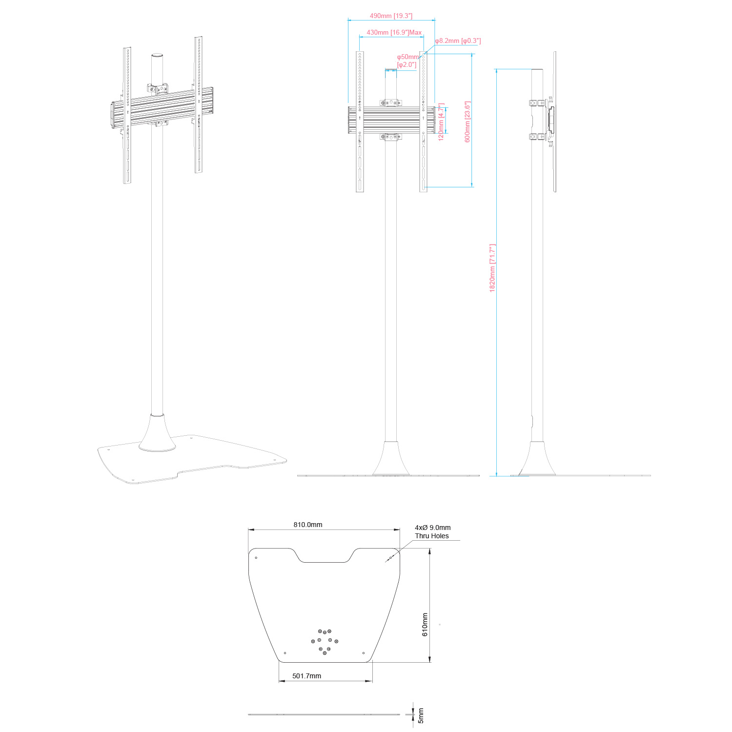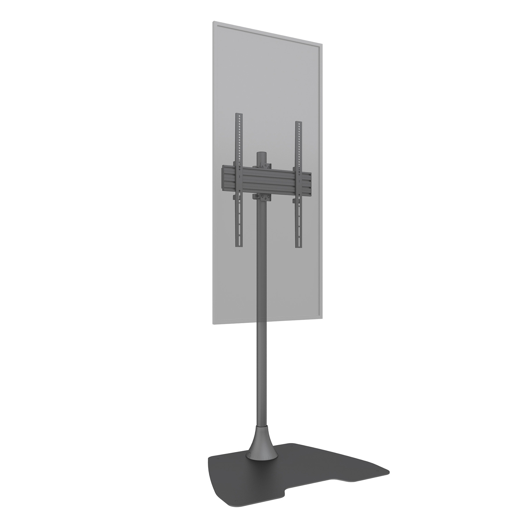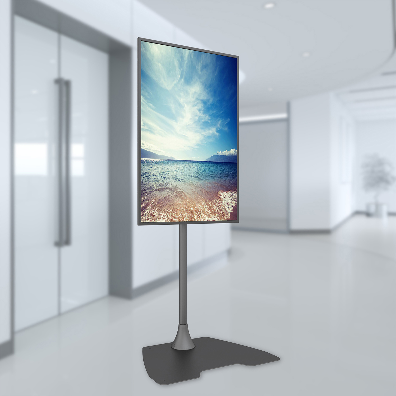 Este soporte profesional está diseñado para pantallas de TV de 55″ a 75″, cumpliendo con los estándares VESA (100x100mm mínimo, 400x600mm máximo) y soporta hasta 50 kg. Se apoya en una robusta base de suelo que puede colocarse o atornillarse. La placa de fijación permite montar la pantalla en modo horizontal. Además, es ajustable en altura hasta 180 cm y giratoria (360°) para adaptarse a sus necesidades. Ideal para tiendas, empresas, exposiciones y áreas públicas.