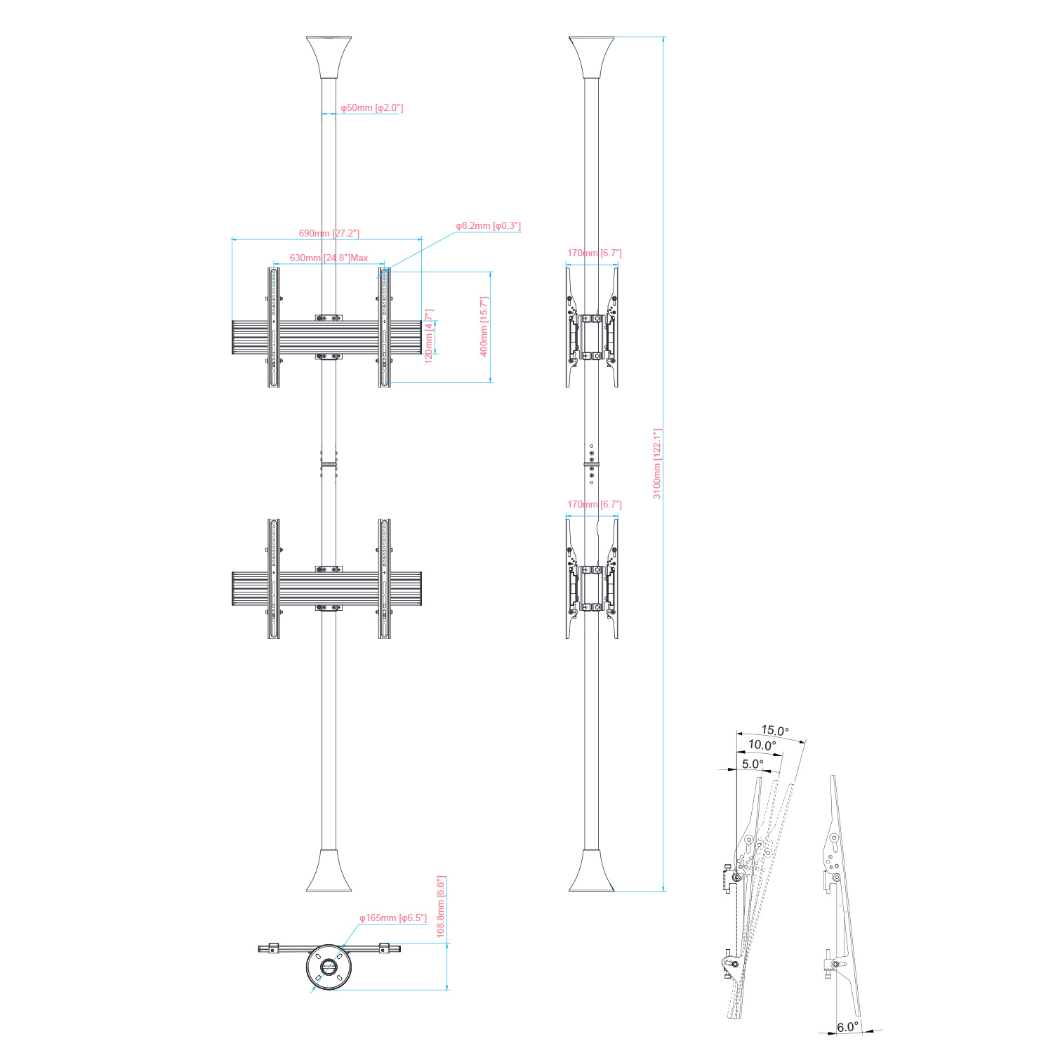 Soporte de suelo-techo inclinable para 4 TV 32´´-75´´ Vesa 600×400