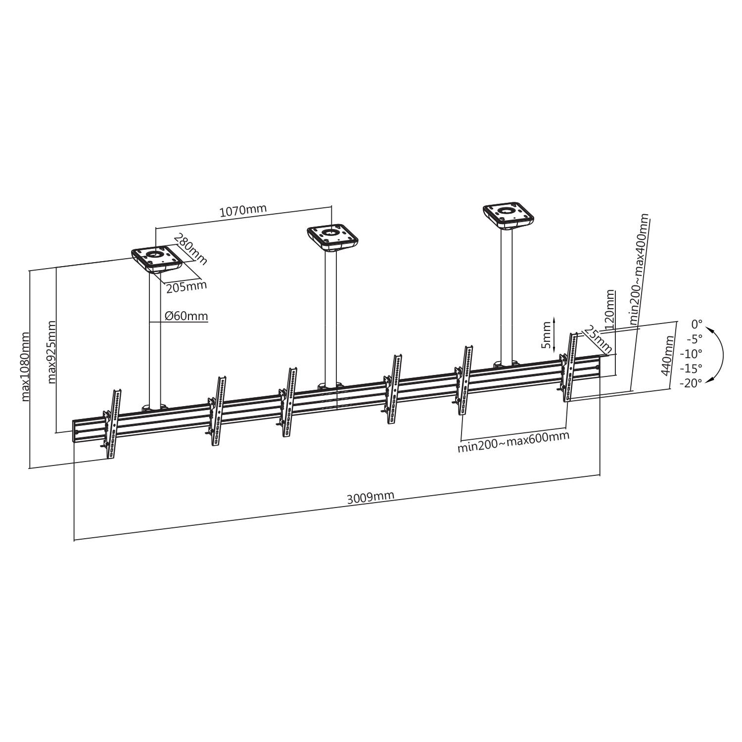 El soporte KIMEX 031-4300K1 está diseñado para montar hasta tres pantallas de TV de 45″ a 50″, compatibles con VESA (100×100 mm mín. – 600×400 mm máx.), con una capacidad de carga de hasta 50 kg por pantalla. Ideal para aplicaciones comerciales, este soporte de techo garantiza una instalación segura en diversas estructuras de techo.